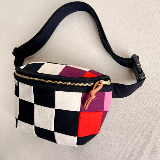 checkerboard fanny bag, black+natural with wine+orange+pink