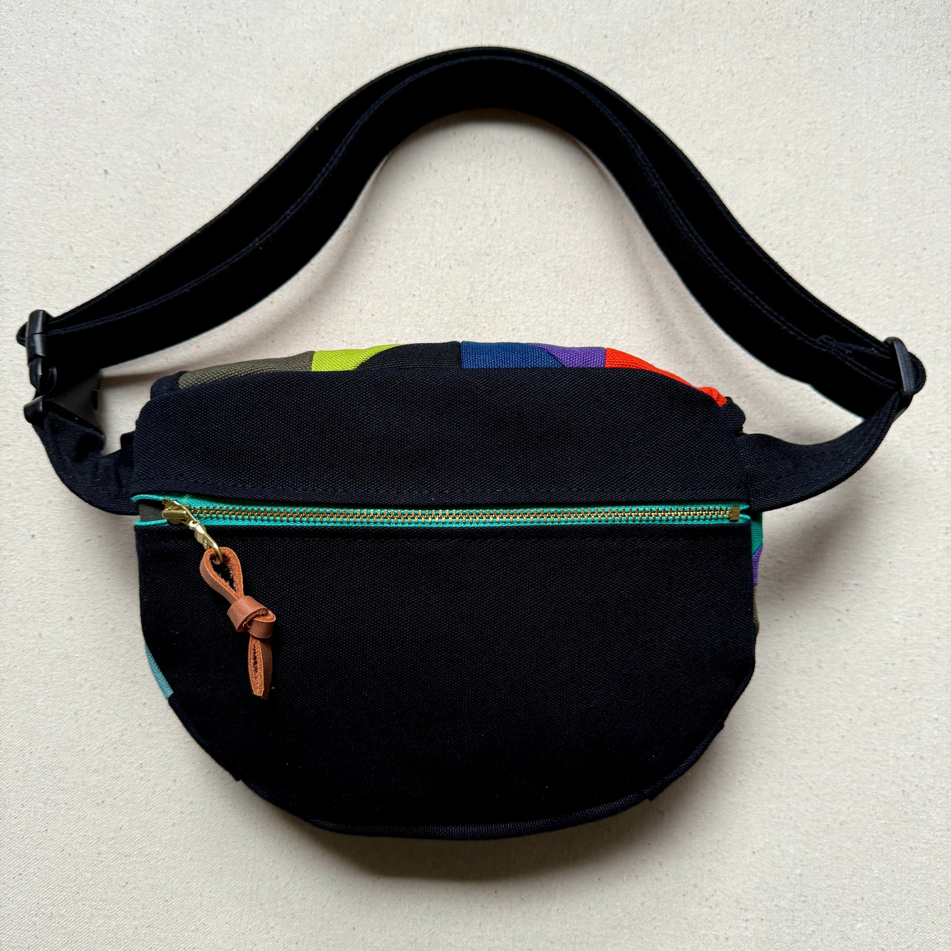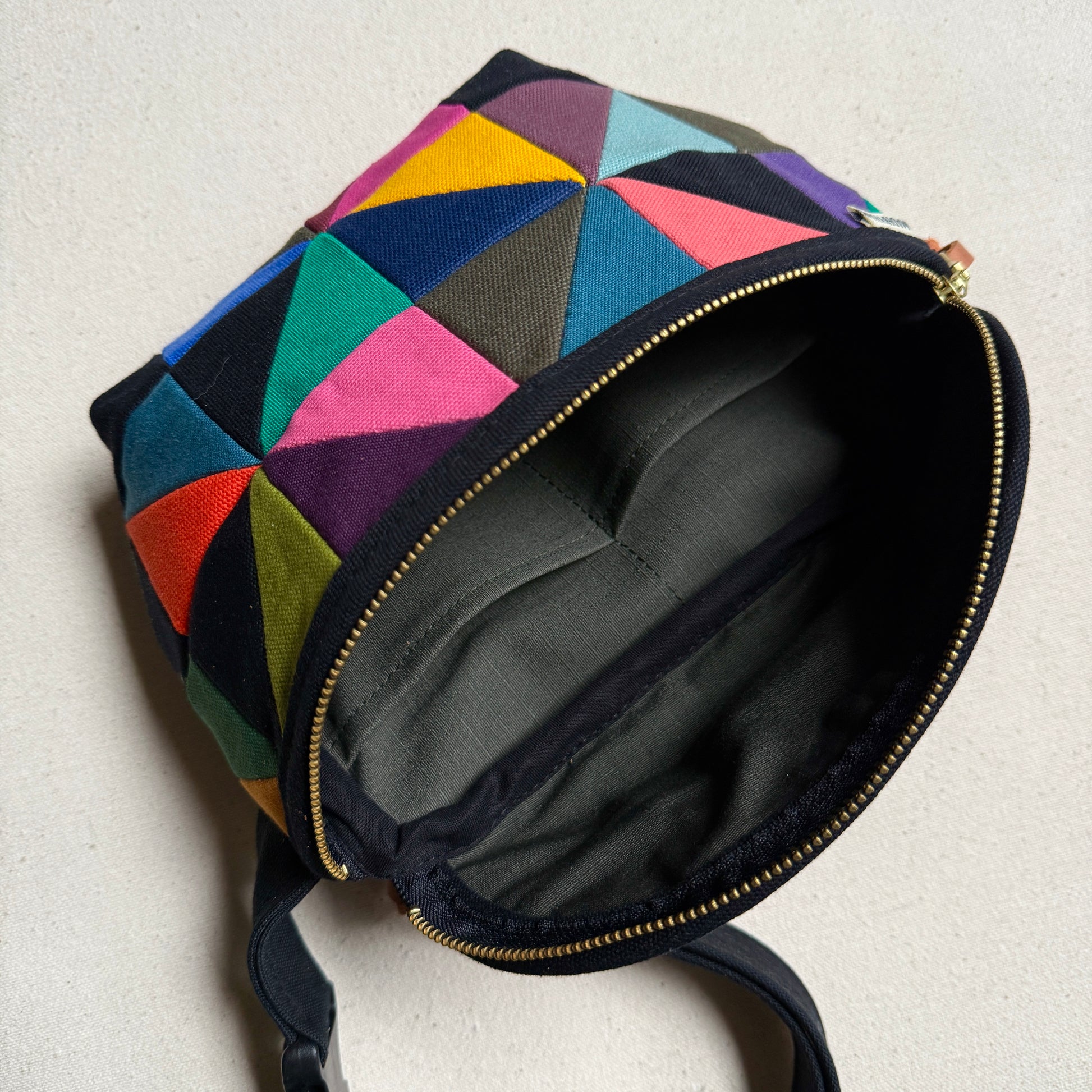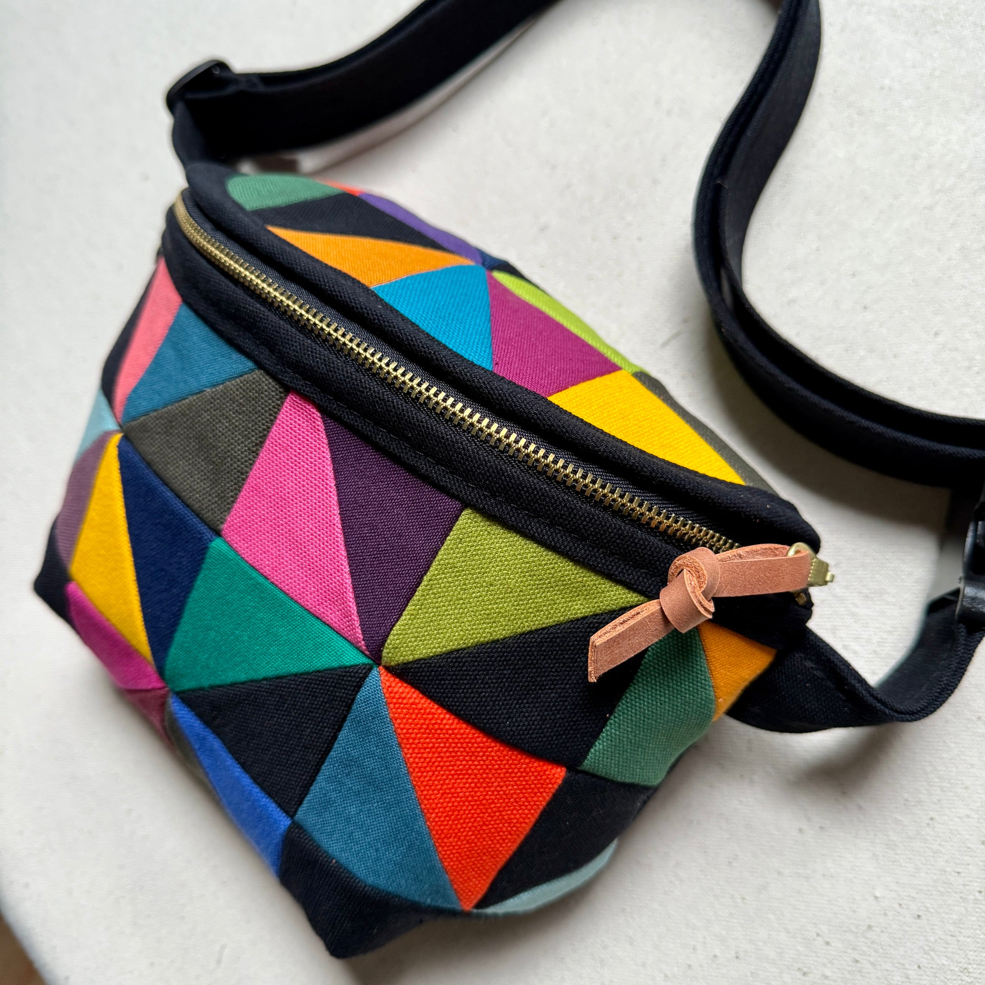 cotton duck canvas, hand cut and patched together to create a fun geometric pattern. extra fun mix of bright colors + black.