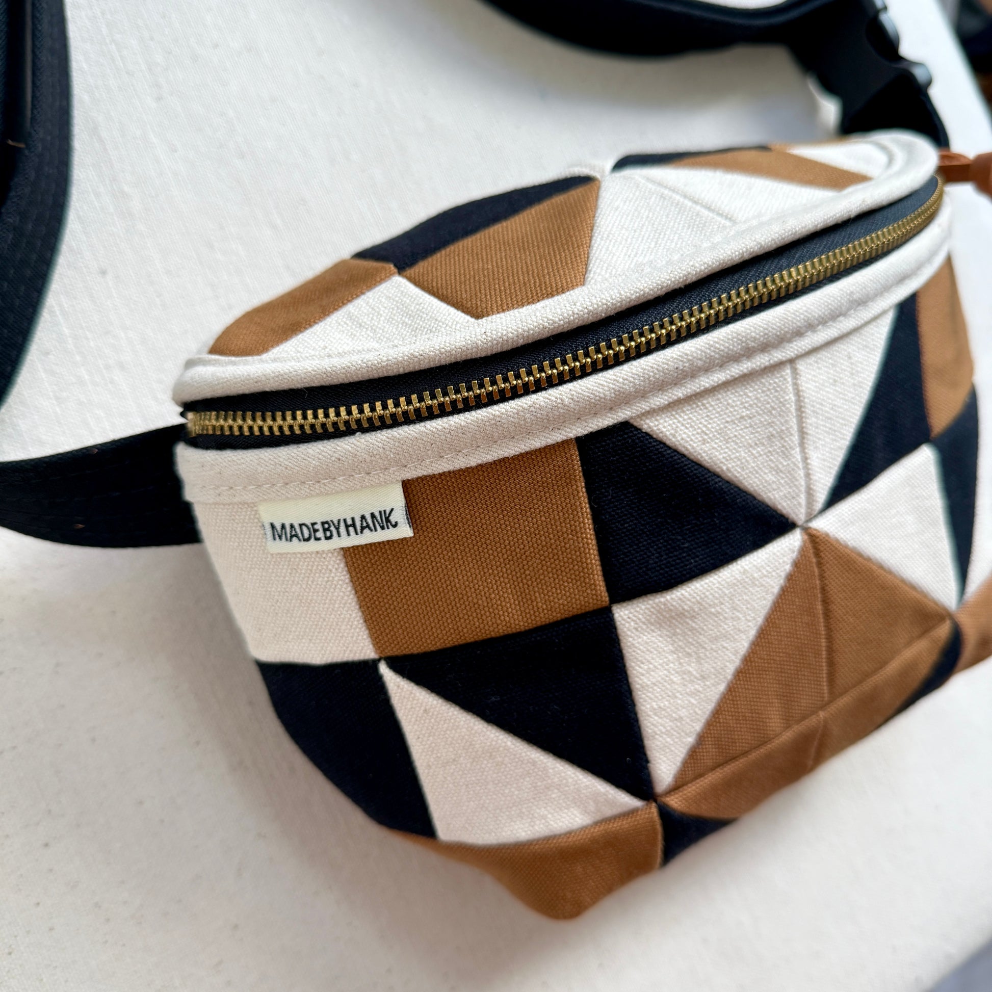 cotton duck canvas, hand cut and patched together to create a sawtooth star pattern, inspired by quilt traditions across the front + flap